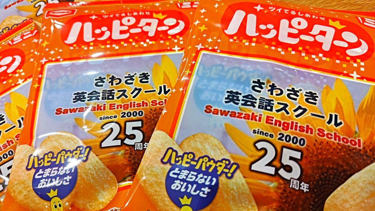 そして、教室のニューズレターでもお知らせしましたが、クイズに答えてくれた生徒たちに教室特製「さわざき英会話スクール25周年ハッピーターン」をプレゼント。