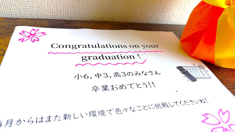 そして、当教室でも小学6年生、中学3年生、高校3年生の皆さんが卒業を迎えました。ご卒業おめでとうございます!!